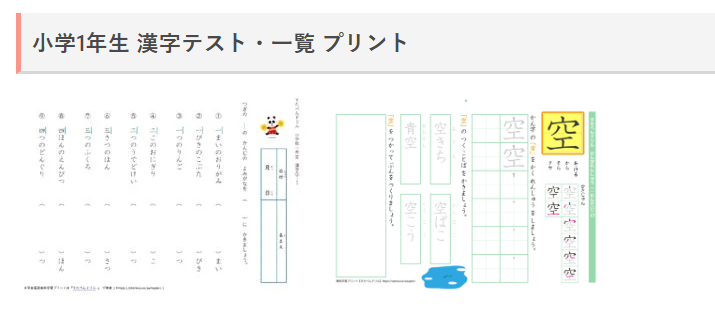 1文字ずつの練習プリントから1年生の漢字まとめプリントまであります。漢字まとめプリントは漢字検定試験対策にもよさそう。